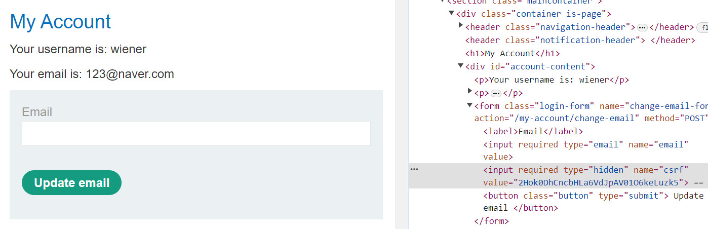 wiener계정에서 익스플로잇 서버로 calros계정의 토큰값을 넣어 이메일을 변경해 보았다.