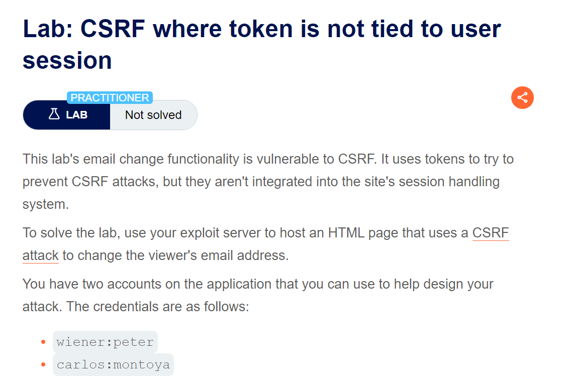 이번 문제는 이메일 변경 기능에 취약점이 존재하고 CSRF 공격을 방지하지만 사이트의 세션 처리 시스템에 통합되지 않는다고 한다. 또한 로그인할 수 있는 계정을 2개 준다.