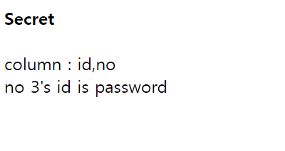 url을 보면 no파라미터로 번호를 받고 있고 no=3을 들어갔을 때 컬럼과 3번의 id가 password라고 출력되는 걸 확인할 수 있다.