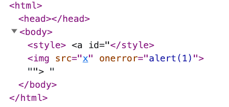 <a id="</style><img src=x onerror=alert(1)>"></a>