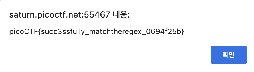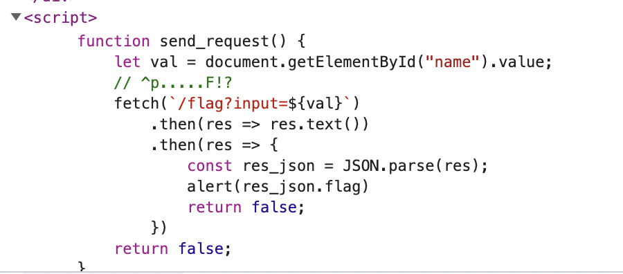 스크립트문에 주석으로 정규표현식이 적혀있고 입력 시 flag가 알림으로 나타나게 되어있다.