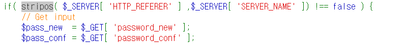 요청을 보면 GET형식으로 새로운 비밀번호와 확인 문자열이 노출되는 것을 알 수 있다.