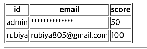 if "<tr><td>admin</td><td>**************</td><td>50</td></tr><tr><td>rubiya</td><td>rubiya805@gmail.com</td><td>100</td></tr>" in res.text: