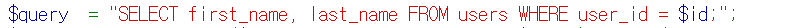 if( isset( $_REQUEST[ 'Submit' ] ) ) { // Get input $id = $_REQUEST[ 'id' ]; switch ($_DVWA['SQLI_DB']) { case MYSQL: // Check database $query = "SELECT first_name, last_name FROM users WHERE user_id = '$id';"; $result = mysqli_query($GLOBALS["___mysqli_ston"], $query ) or die( '<pre>' . ((is_object($GLOBALS["___mysqli_ston"])) ? mysqli_error($GLOBALS["___mysqli_ston"]) : (($___mysqli_res = mysqli_connect_error()) ? $___mysqli_res : false)) . '</pre>' ); // Get results while( $row = mysqli_fetch_assoc( $result ) ) { // Get values $first = $row["first_name"]; $last = $row["last_name"]; // Feedback for end user echo "<pre>ID: {$id}<br />First name: {$first}<br />Surname: {$last}</pre>"; } mysqli_close($GLOBALS["___mysqli_ston"]); break; case SQLITE: global $sqlite_db_connection; #$sqlite_db_connection = new SQLite3($_DVWA['SQLITE_DB']); #$sqlite_db_connection->enableExceptions(true); $query = "SELECT first_name, last_name FROM users WHERE user_id = '$id';"; #print $query; try { $results = $sqlite_db_connection->query($query); } catch (Exception $e) { echo 'Caught exception: ' . $e->getMessage(); exit(); } if ($results) { while ($row = $results->fetchArray()) { // Get values $first = $row["first_name"]; $last = $row["last_name"]; // Feedback for end user echo "<pre>ID: {$id}<br />First name: {$first}<br />Surname: {$last}</pre>"; } } else { echo "Error in fetch ".$sqlite_db->lastErrorMsg(); } break; } } ?> |